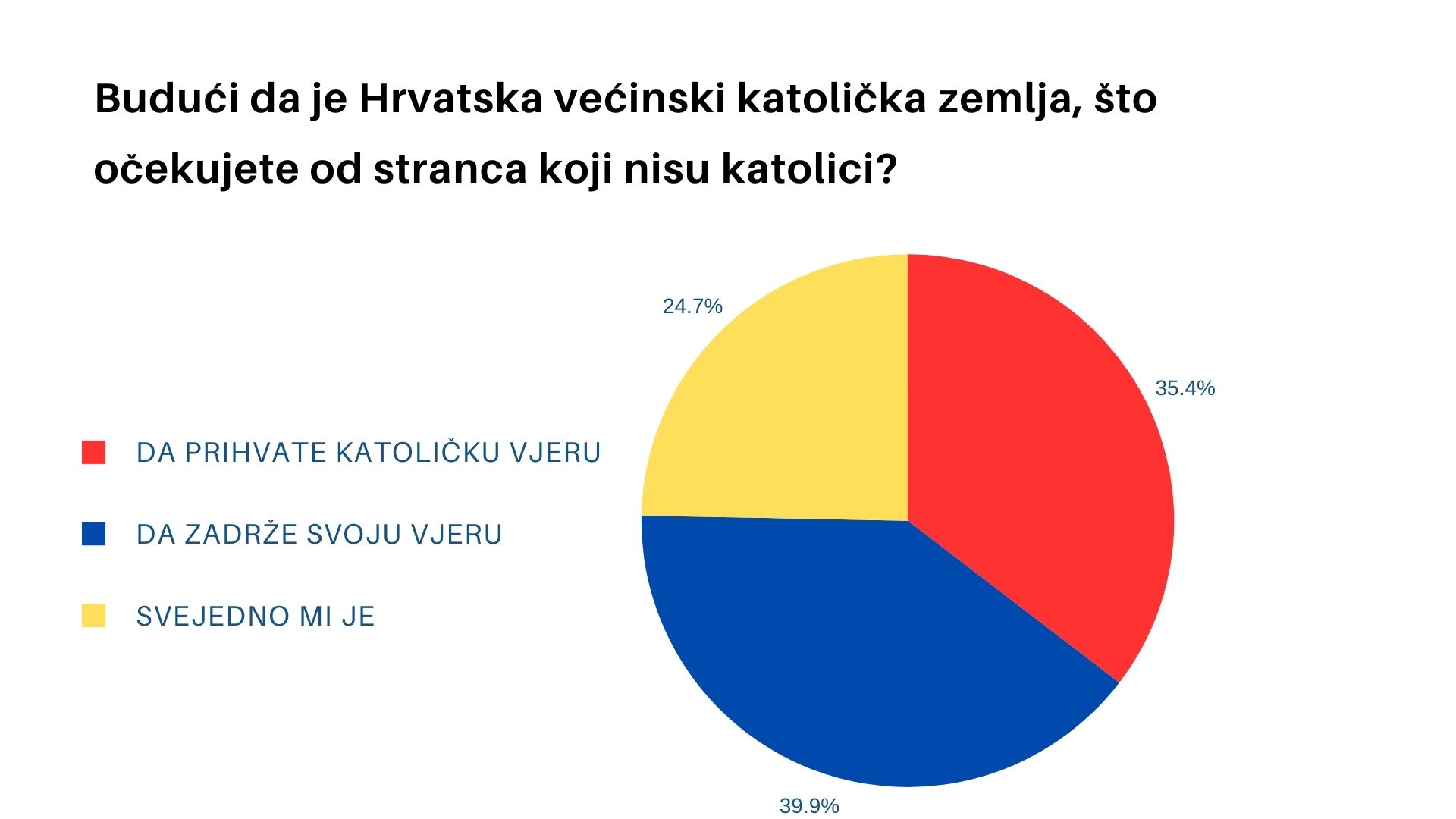 Budući da je Hrvatska većinski katolička zemlja, ispitanici su mogli odgovoriti da od stranaca koji nisu katolici očekuju: da zadrže svoju vjeroispovijest (39.9 %), da prihvate katoličku vjeru (35.4 %) ili da im je svejedno (24.7 %). Ti rezultati nisu u skladu s Isusovim misijskim nalogom učenicima nakon uskrsnuća: „Idite zato i učinite sve narode mojim učenicima krsteći ih u ime Oca i Sina i Svetoga Duha“ (Mt 28, 19).