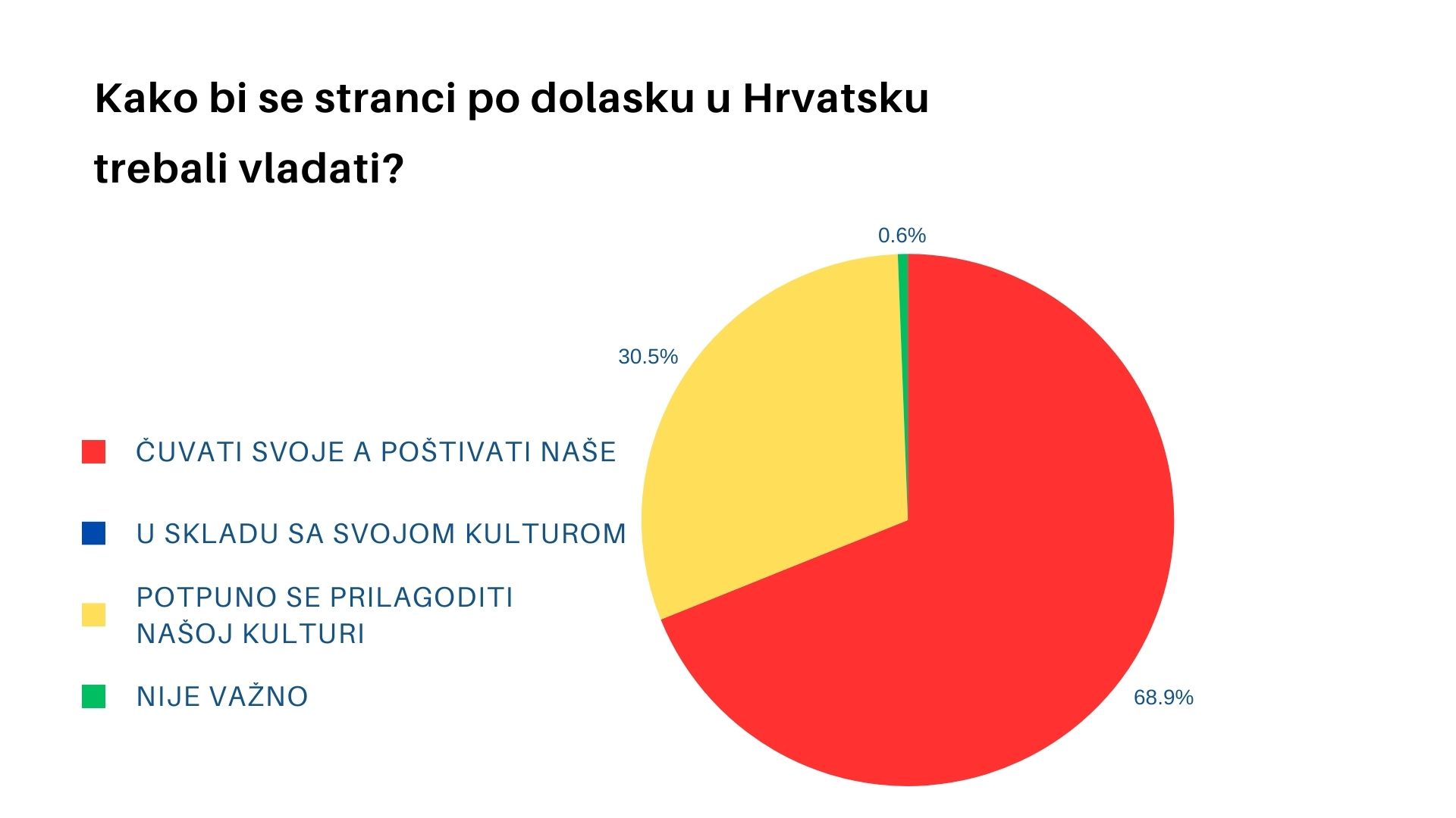 S obzirom na to anketom su provjerena očekivanja domaćina od doseljenika. Uvjerljivo dvotrećinska većina smatra da bi po dolasku u našu zemlju trebali čuvati svoje, a poštivati naše (68.9 %). Za potpunu prilagodbu stranaca našoj kulturi izjasnilo se 30.5 %, a da to uopće nije važno misle samo dvije osobe.