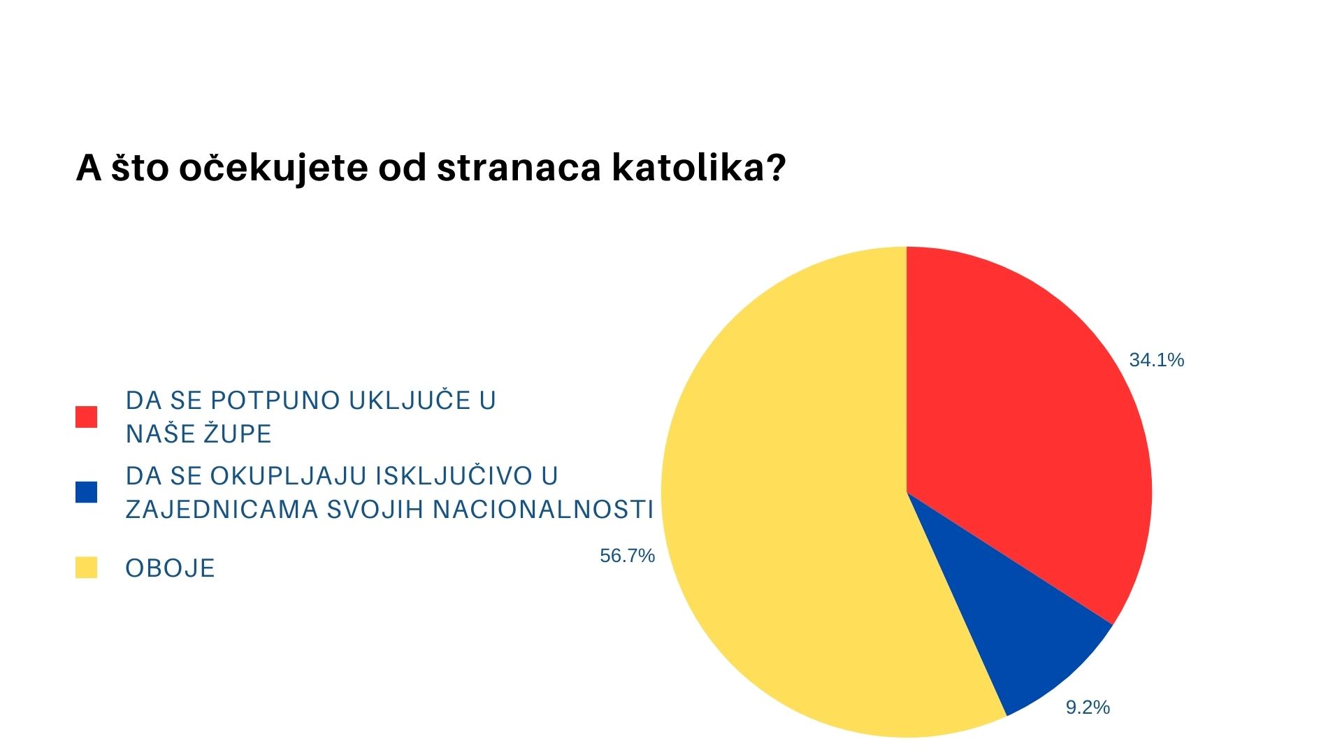 No, među ispitanicima ima onih koji smatraju da se pridošli katolici trebaju okupljati isključivo u zajednicama svojih nacionalnosti (9.2 %). Više ih ipak smatra da se trebaju potpuno uključiti u naše župne zajednice (34.1 %). Većina (56.7 %) je za kombinaciju obaju. Takvo iskustvo ima i Crkva u Hrvata koja je našim iseljenicima bila oslonac u stranom svijetu. Tako su imali mjesto gdje mogu njegovati svoj jezik, običaje i vezu s rodnim krajem, postupno se uključujući u život domaće partikularne crkvene zajednice.