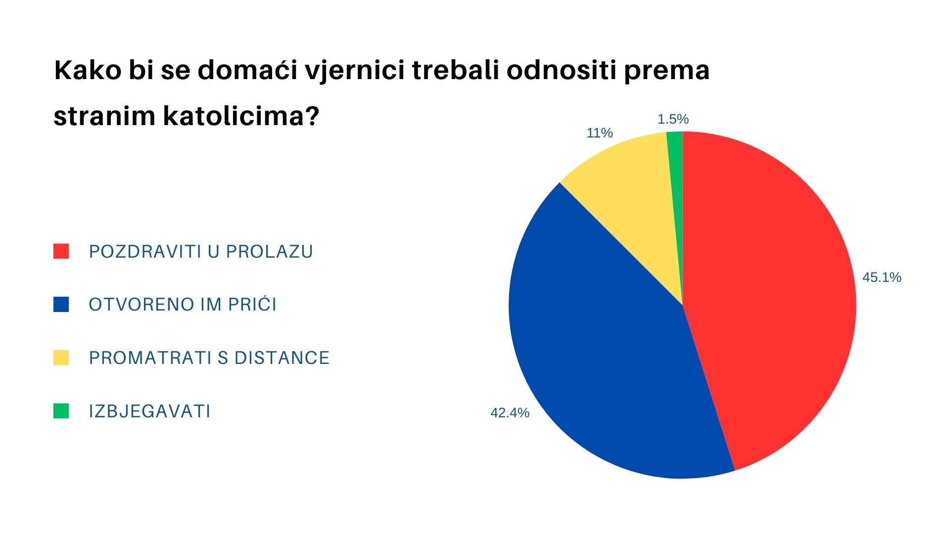 U kojoj je mjeri stav otvorenosti koji se pritom podrazumijeva prisutan kod domaćih vjernika odražava pitanje kako bi se trebali odnositi prema strancima koji dolaze u katoličke crkve. Da ih treba pozdraviti u prolazu mišljenje je 45.2 % ispitanika, a da im treba otvoreno prići njih 42.4 %. Jedanaest posto ih je za promatranje s distance, a za izbjegavanje svega 1.5 %.