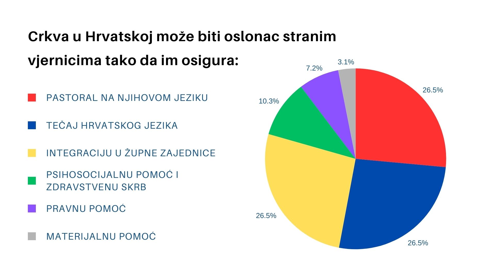 Gotovo 80 % ukupnih odgovora u otprilike istom omjeru se redom odnosilo na: tečaj hrvatskoga jezika, integraciju u župne zajednice i pastoral na njihovom jeziku. Odgovor koji je uključivao psihosocijalnu pomoć i zdravstvenu skrb dobio je nešto više od desetine glasova. Nešto više od sedam posto dobila je pravna pomoć radi zaštite dostojanstva i ostvarivanja prava. Kao najmanje potrebna među ponuđenima označena je materijalna pomoć.