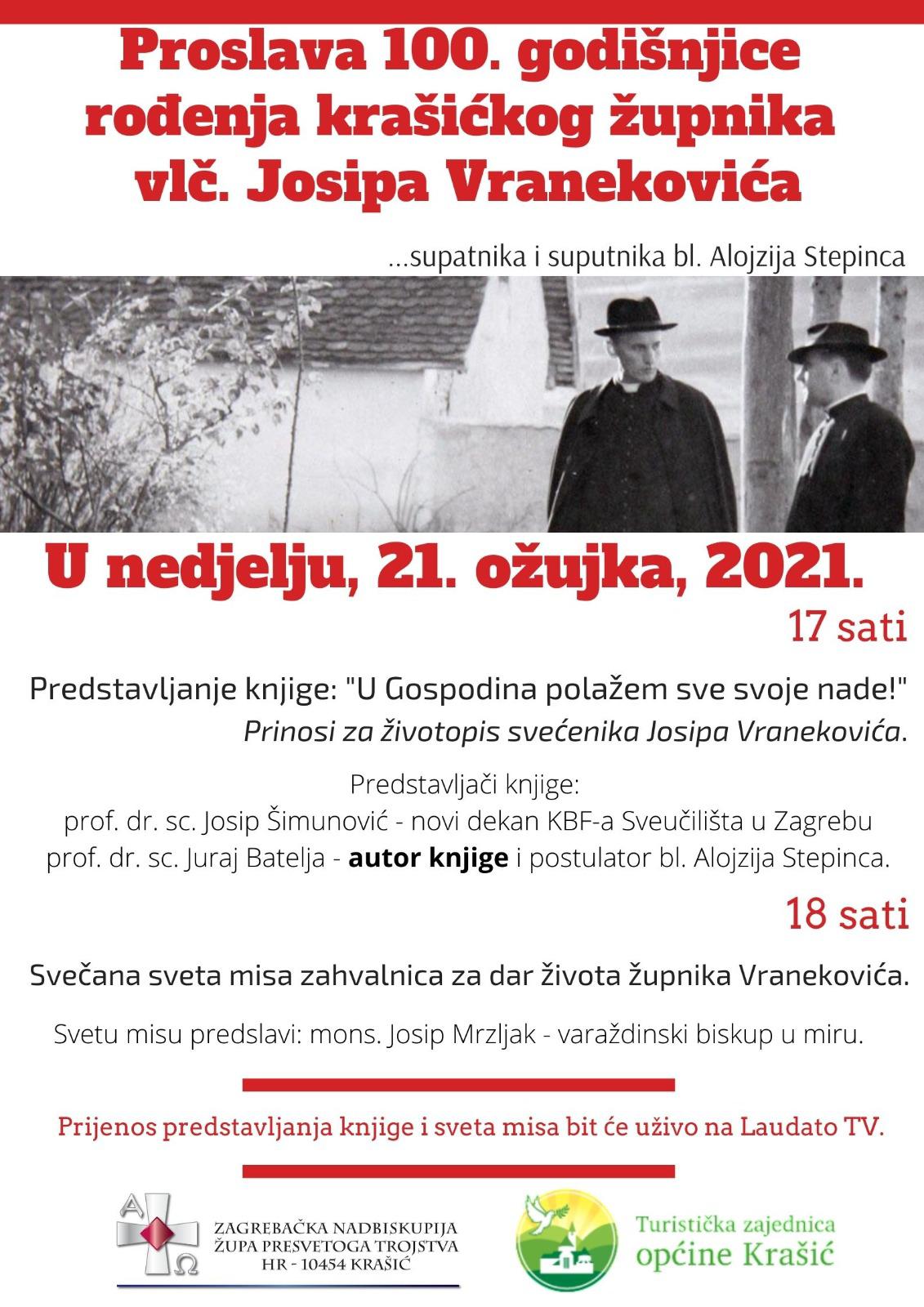 Proslava 100. obljetnice rođenja krašićkoga župnika Josipa Vranekovića, suputnika i supatnika bl. Alojzija Stepinca, počinje u nedjelju 21. ožujka u 17 sati u Župi Presvetog Trojstva u Krašiću predstavljanjem knjige “U Gospodina polažem svoje nade” – prilozi za životopis svećenika Josipa Vranekovića.
