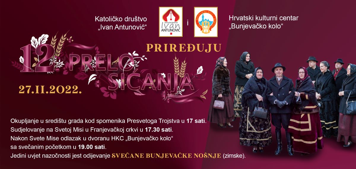 Hrvatski kulturni centar „Bunjevačko kolo“ i Katoličko društvo „Ivan Antunović“ u nedjelju 27. veljače priređuju u Subotici 12. Prelo sićanja.
