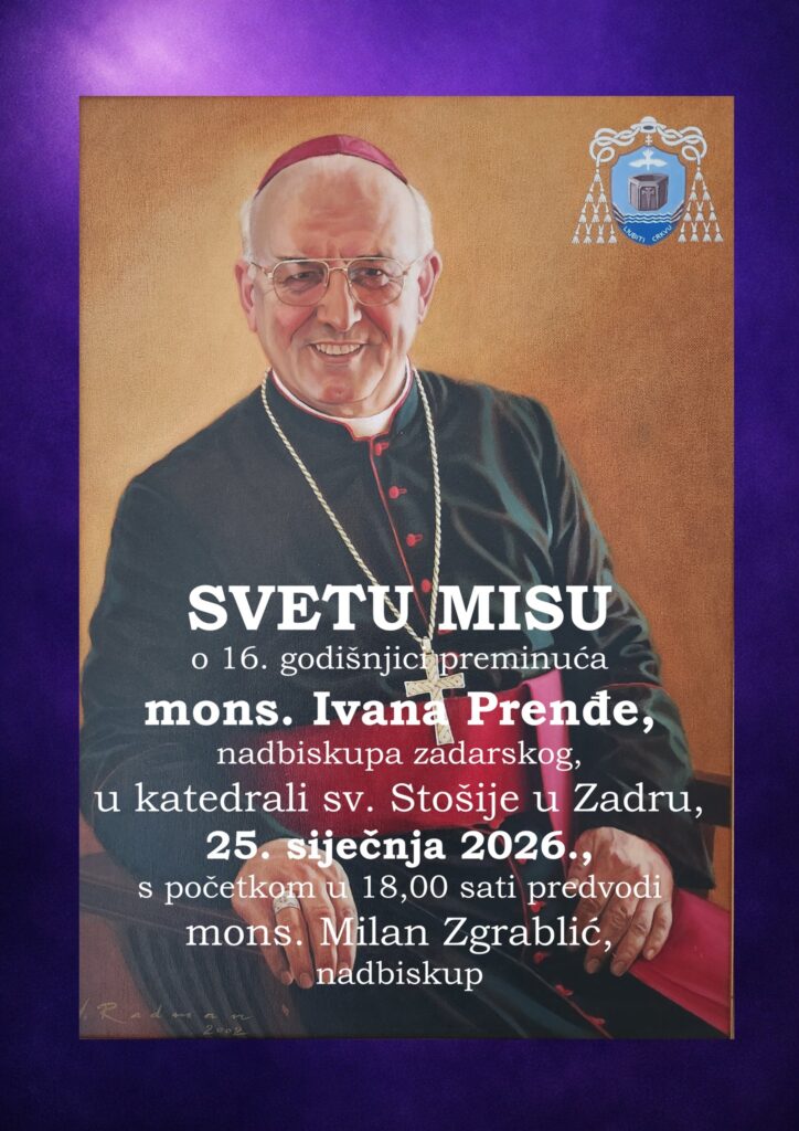 Na 16. obljetnicu smrti zadarskog nadbiskupa Ivana Prenđe, misu u katedrali sv. Stošije u Zadru u nedjelju 25. siječnja s početkom u 18 sati predvodi zadarski nadbiskup Milan Zgrablić.