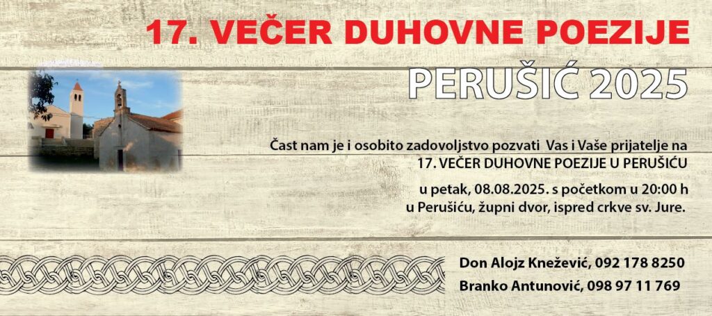 Sedamnaesta večer duhovne poezije održat će se 8. kolovoza od 20 sati ispred crkve sv. Jure u Perušiću.