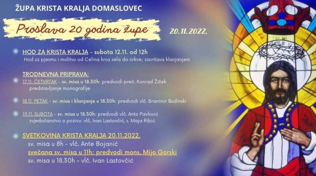 Domaslovec, (IKA) – Župa Krista Kralja u Domaslovcu slavi 20. obljetnicu postojanja, a svečanu misu na župnu svetkovinu u nedjelju, 20. studenog u 11 sati u župnoj crkvi predvodit će zagrebački pomoćni biskup Mijo Gorski. Euharistiju u 8 sati slavit će župnik vlč. Ante Bojanić, a u 18.30 sati vlč. Ivan Lastovčić.