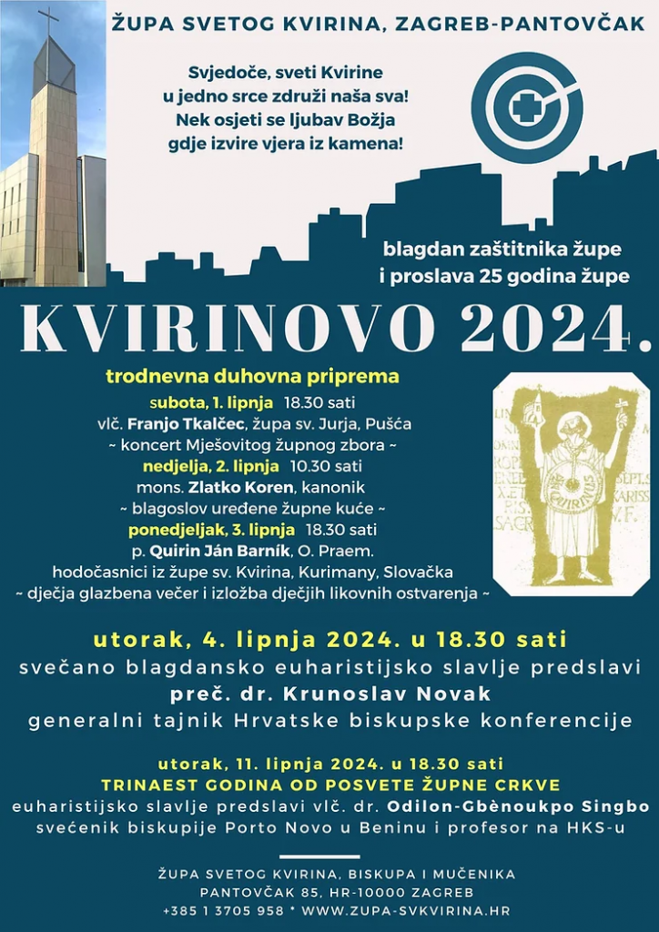 Zagreb, (IKA) – Svetkovinu nebeskog zaštitnika i 25. obljetnicu postojanja proslavit će u utorak 4. lipnja Župa sv. Kvirina na Pantovčaku.