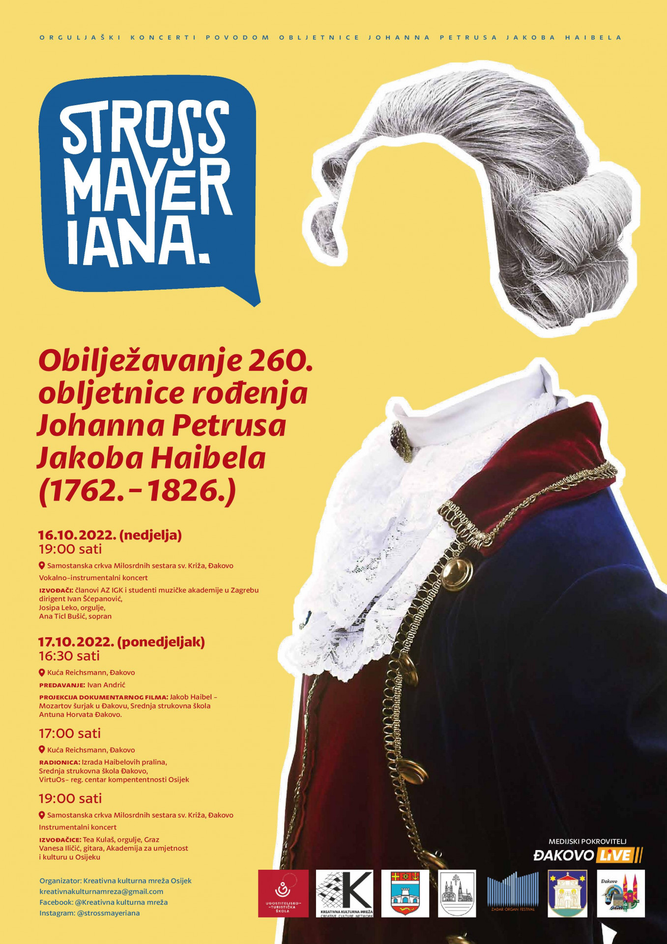 Pod pokroviteljstvom Osječko-baranjske županije, Đakovačko-osječke nadbiskupije i Grada Đakova, u organizaciji Kreativne kulturne mreže Osijek, u Đakovu će se u nedjelju 16. i ponedjeljak 17. listopada održati program obilježavanja 260. obljetnice rođenja Johanna Petrusa Jakoba Haibela (1762. – 1826.).