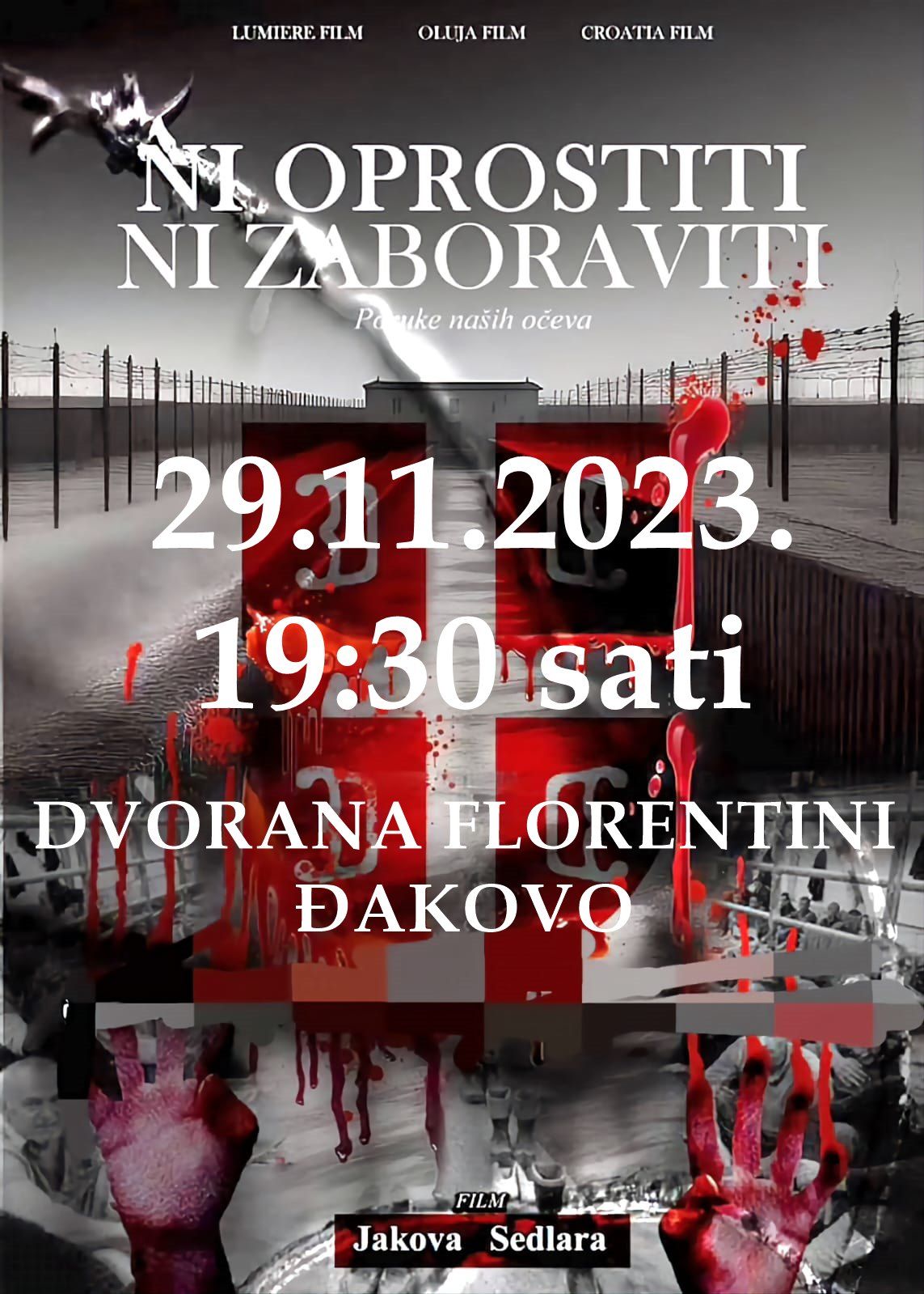 ĐAKOVO (TU) – U srijedu, 29. studenoga 2023. godine, u 19.30 sati, u dvorani Florentini, Frankopanska 1A, u Đakovu bit će prikazan dokumentarni film Jakova Sedlara “Ni oprostiti ni zaboraviti”, o stradanju Hrvata u srpskim logorima. Za sve zainteresirane ulaz je slobodan.