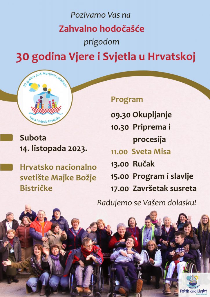 Zajednica „Vjera i svjetlo“ proslavit će 30. obljenicu osnutka u Hrvatskoj u subotu 14. listopada 2023. zahvalnim hodočašćem u Mariju Bistricu pod geslom „30 godina pod Marijinim plaštem“.