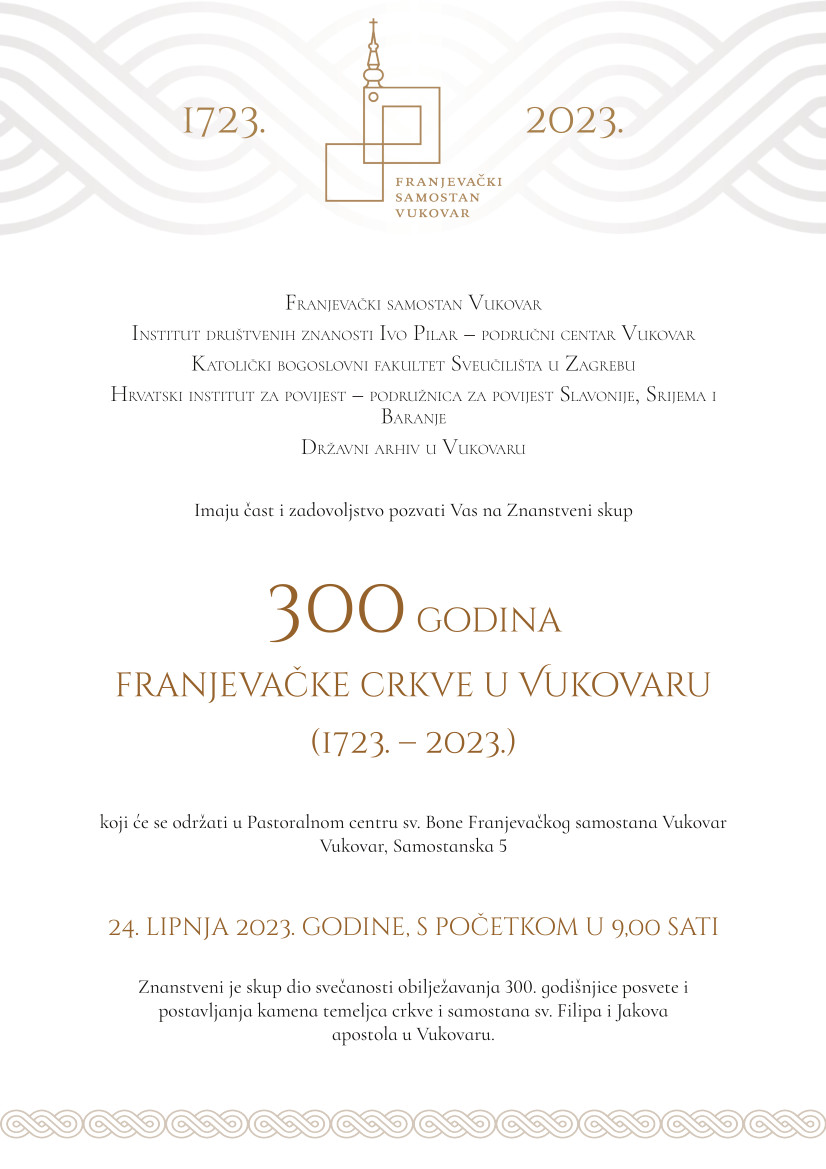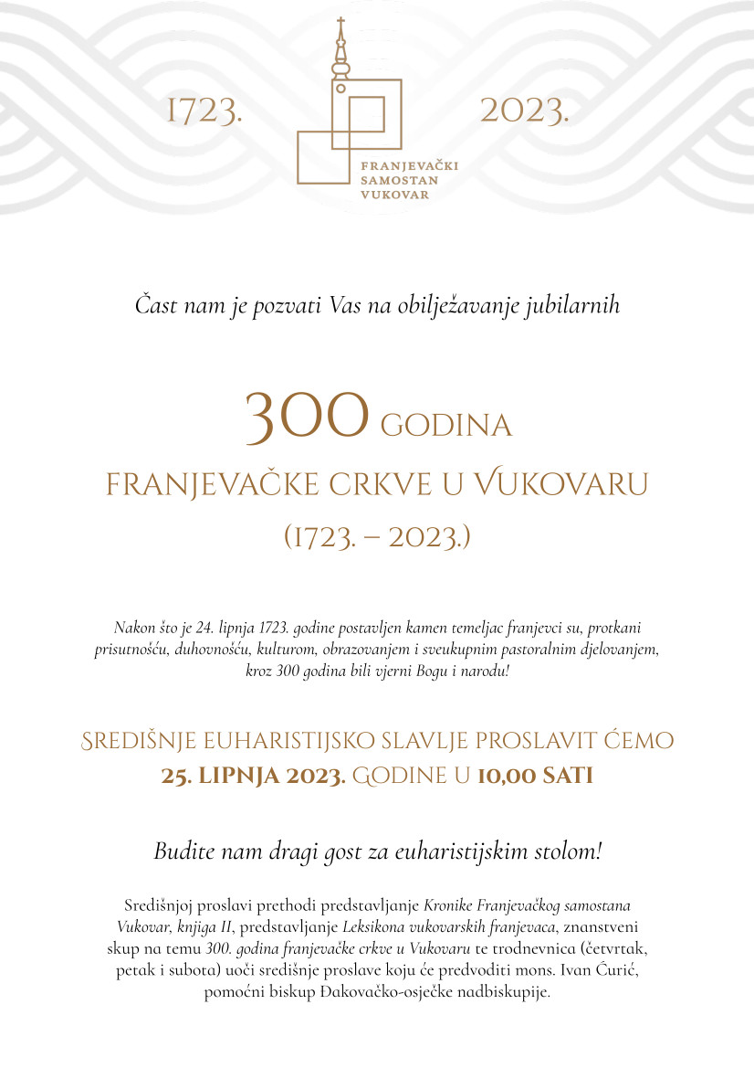 Proslavi prethodi trodnevnica te predstavljanje Kronike Franjevačkog samostana Vukovar, knjiga II, predstavljanje Leksikona vukovarskih franjevaca i znanstveni skup o temi 300. godina franjevačke crkve u Vukovaru, koji će biti održan u subotu 24. lipnja s početkom u 9 sati u Pastoralnom centru sv. Bone Franjevačkog samostana .