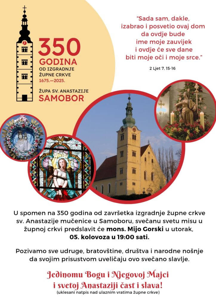 Misom uz Dan pobjede i domovinske zahvalnosti i Dan hrvatskih branitelja u utorak 5. kolovoza župna zajednica sv. Anastazije mučenice u Samoboru i hodočasnici koji su sudjelovali u samoborskom zavjetnom hodočašću u Mariju Bistricu zahvalit će Bogu na 350 godina od izgradnje župne crkve