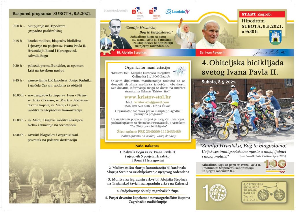 Zagreb, (IKA) – Uz Stepinčev rođendan, u zahvalnom sjećanju na pohode sv. Ivana Pavla II. Hrvatskoj i BiH, Kristov Stol – Misijska Europska Inicijativa organizira 4. obiteljsku biciklijadu sv. Ivana Pavla II. u subotu 8. svibnja, pod pokroviteljstvom grada Zagreba, uz medijsko pokroviteljstvo Hrvatske katoličke mreže.