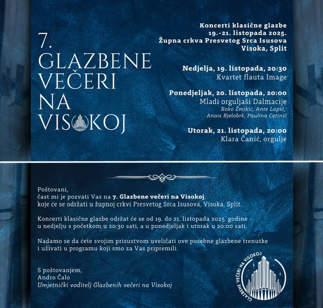 Sedme Glazbene večeri na Visokoj održat će se od nedjelje 19. do utorka 21. listopada u župnoj crkvi Presvetog Srca Isusova na Visokoj u Splitu.