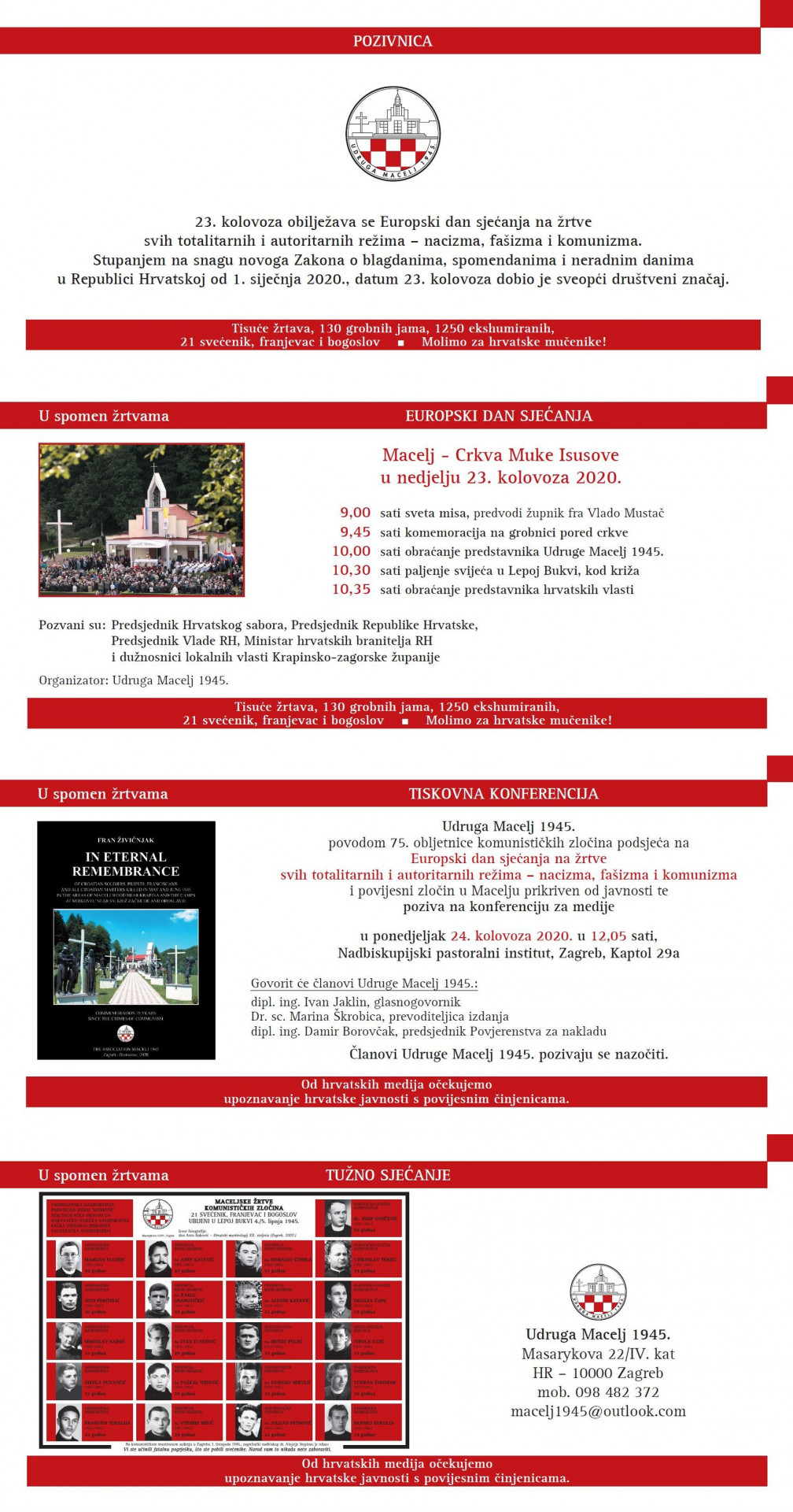 U ponedjeljak 24. kolovoza, u sklopu Europskog dana sjećanja na žrtve svih totalitarnih i autoritarnih režima – nacizma, fašizma i komunizma, Udruga Macelj 1945. će u Zagrebu održati konferenciju za novinare. U povodu 75. obljetnice komunističkih zločina na Macelju, konferencija će se održati u ponedjeljak 24. kolovoza s početkom u 12.05 sati u Nadbiskupijskom pastoralnom institutu, Zagreb, Kaptol 29a. Govorit će članovi Udruge Macelj 1945.: