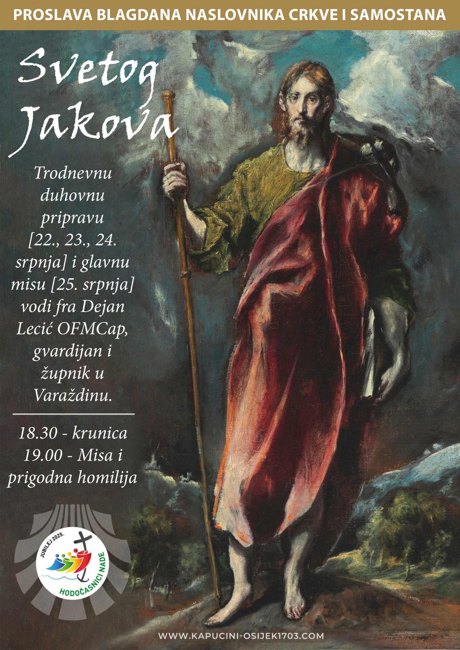 Zajednica franjevaca kapucina u Samostanu sv. Jakova u Osijeku proslavit će 25. srpnja svetkovinu svog nebeskog zaštitnika. Proslavi prethodi trodnevnica od 22. do 24. srpnja. Euharistijska slavlja svakoga dana, kao i na svetkovinu, predvodit će gvardijan kapucinskog samostana u Varaždinu fra Dejan Lecić.