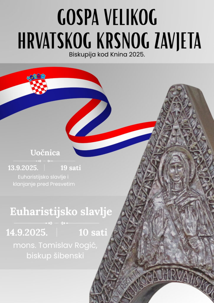 Blagdan Gospe velikoga hrvatskog krsnog zavjeta svečano će se proslaviti u Biskupiji kod Knina. Program počinje uoči blagdana, u subotu 13. rujna u 19 sati, euharistijskim slavljem i klanjanjem pred Presvetim.