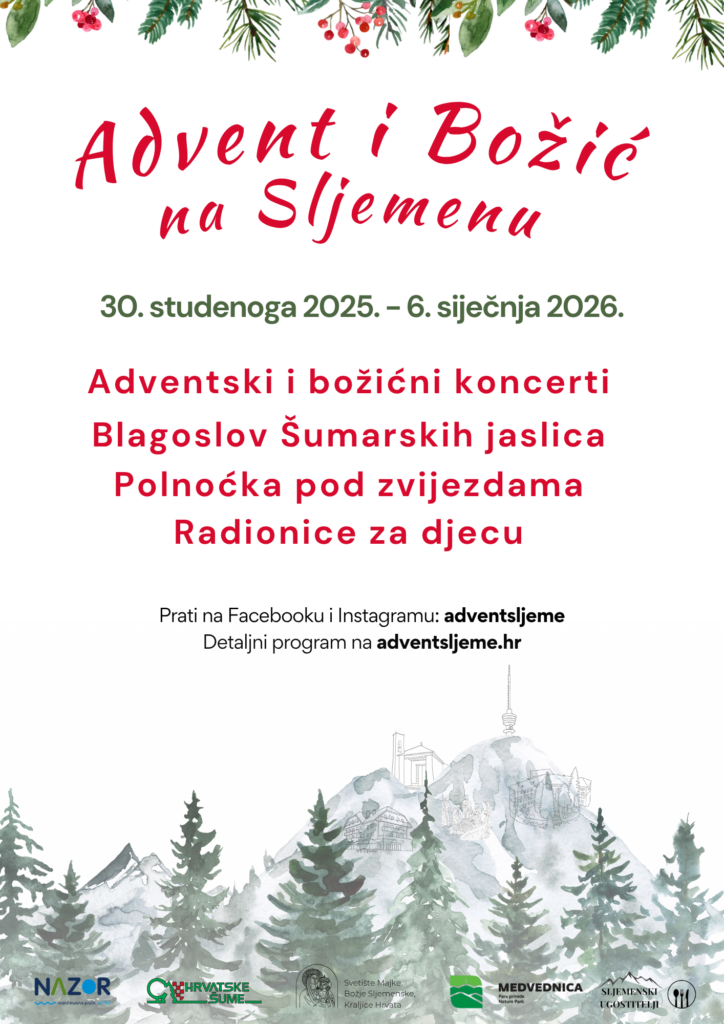 Otvorenje Adventa održat će se u nedjelju, 30. studenoga. Program započinje misom u 12 sati, koju predvodi dječji zbor Samoborski krijes, nakon čega će u kapelici uslijediti kratki adventski koncert. Potom će sudionici krenuti prema apartmanima Snježne Kraljice, gdje će biti blagoslov i paljenje prve adventske svijeće uz pjesmu dječjeg zbora.