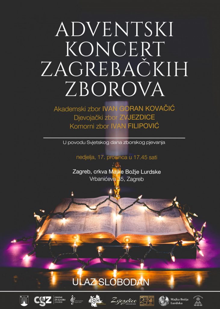 Adventski koncert zagrebačkih zborova održat će se u nedjelju, 17. prosinca 2023. u crkvi Majke Božje Lurdske u Zagrebu. Nastupit će Akademski zbor „Ivan Goran Kovačić“, Djevojački zbor „Zvjezdice“ i Komorni zbor „Ivan Filipović“. Koncert će početi u 18 sati.
