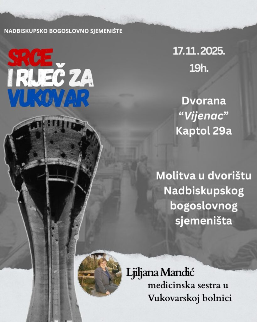 Nadbiskupsko bogoslovno sjemenište u Zagrebu i ove godine povodom Dana sjećanja na žrtve Domovinskoga rata i Dana sjećanja na žrtvu Vukovara i Škabrnje organizira svečanu akademiju „Srce i riječ za Vukovar“. Akademija će se održati u ponedjeljak 17. studenoga u 19 sati u dvorani „Vijenac“ Nadbiskupijskog pastoralnog instituta u Zagrebu. Svoje svjedočanstvo izreći će medicinska sestra u vukovarskoj bolnici Ljiljana Mandić, a nakon toga u dvorištu će se upriličiti molitva za sve stradale.