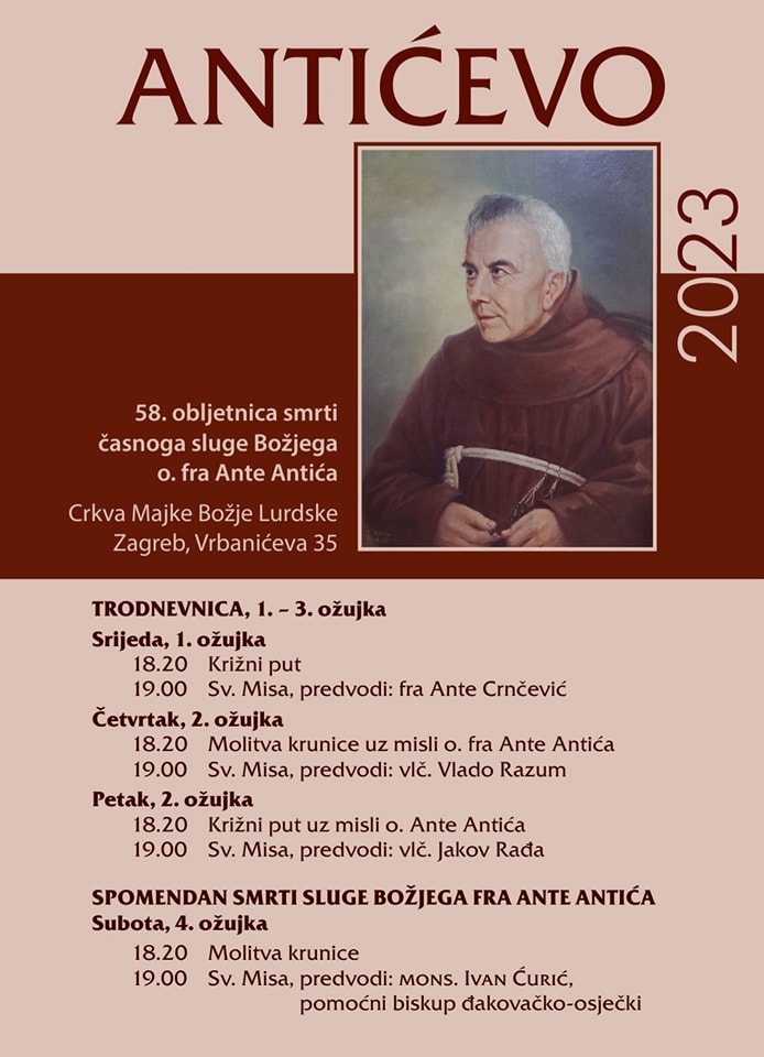 U crkvi Majke Božje Lurdske gdje počiva tijelo časnog sluge Božjega Ante Antića u subotu 4. ožujka 2023. bit će proslavljena 58. obljetnica njegove smrti.