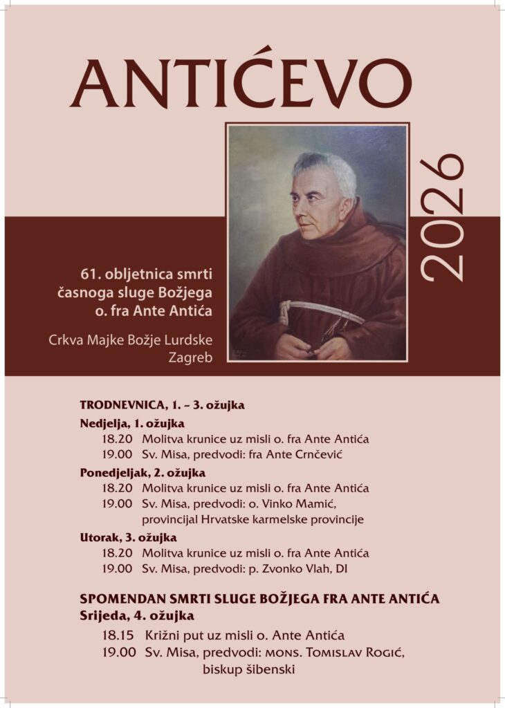 Spomendan smrti časnog sluge Božjega fra Ante Antića bit će proslavljen u srijedu, 4. ožujka, u Župi Majke Božje Lurdske u Zagrebu. Svečano misno slavlje u 19 sati predvodit će šibenski biskup Tomislav Rogić. U 18.15 molit će se križni put uz misli o. fra Ante Antića.