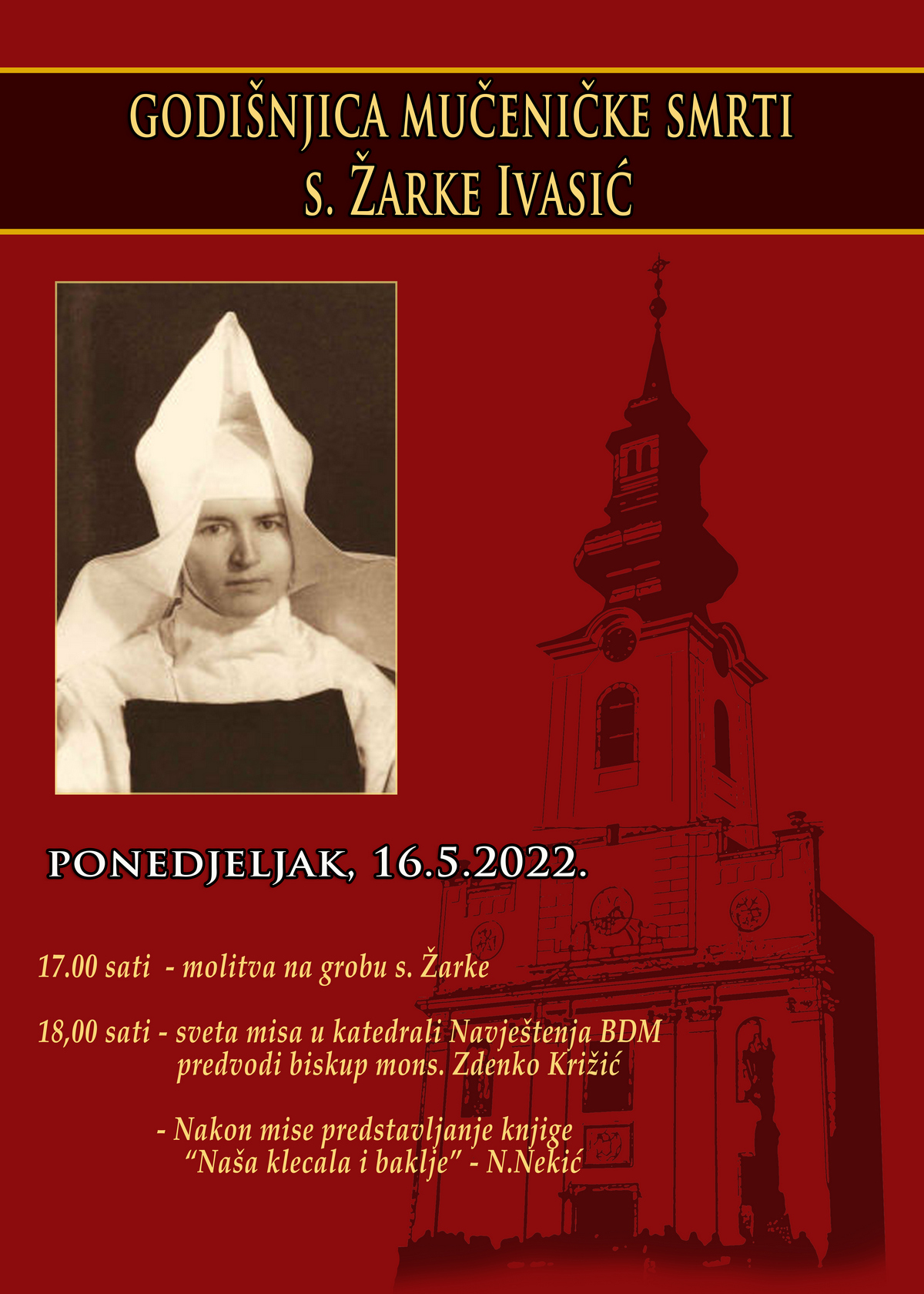 U ponedjeljak 16. svibnja, na 76. obljetnicu mučeničke smrti službenice Božje s. Žarke Ivasić, gospićko-senjski biskup Zdenko Križić predvodit će misu u gospićkoj katedrali u 18 sati.