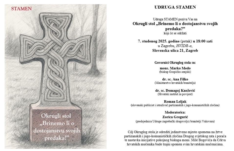 Udruga STAMEN organizira okrugli stol „Brinemo li o dostojanstvu svojih predaka?” koji će se održati u petak 7. studenog u 18 sati u prostorijama HVIDR-a u Zagrebu, Slovenska ulica 21.