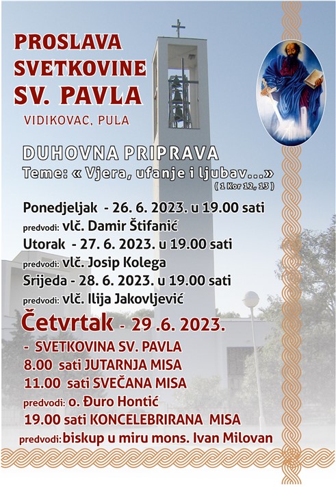 O svetkovini sv. Petra i Pavla apostola, u četvrtak 29. lipnja, svečano koncelebrirano misno slavlje u Župi sv. Pavla u Puli s početkom u 19 sati predvodit će porečki i pulski biskup u miru Ivan Milovan. Svečanu misu poldanicu s početkom u 11 sati predvodit će o. Đuro Hontić, župnik pulske Župe sv. Ivana Krstitelja.
