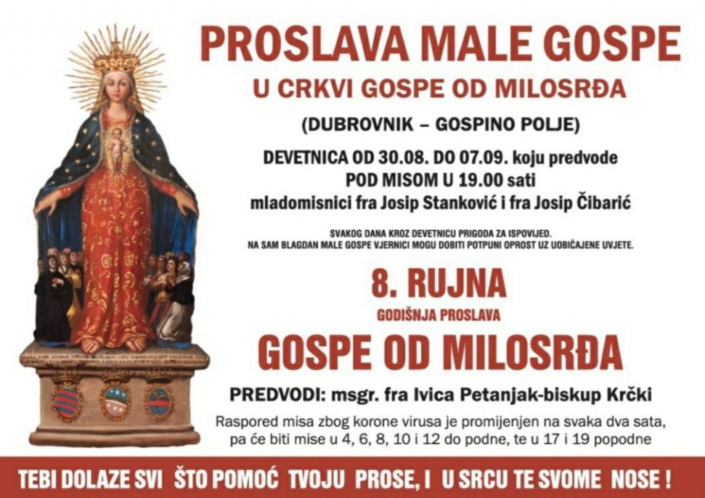 Svetkovine Male Gospe u Biskupijskom svetištu Gospe od Milosrđa u Gospinu polju u Dubrovniku proslavit će se u utorak 8. rujna, a središnje svečano euharistijsko slavlje na vanjskom liturgijskom prostoru svetišta u 19 sati predvodit će krčki biskup Ivica Petanjak.