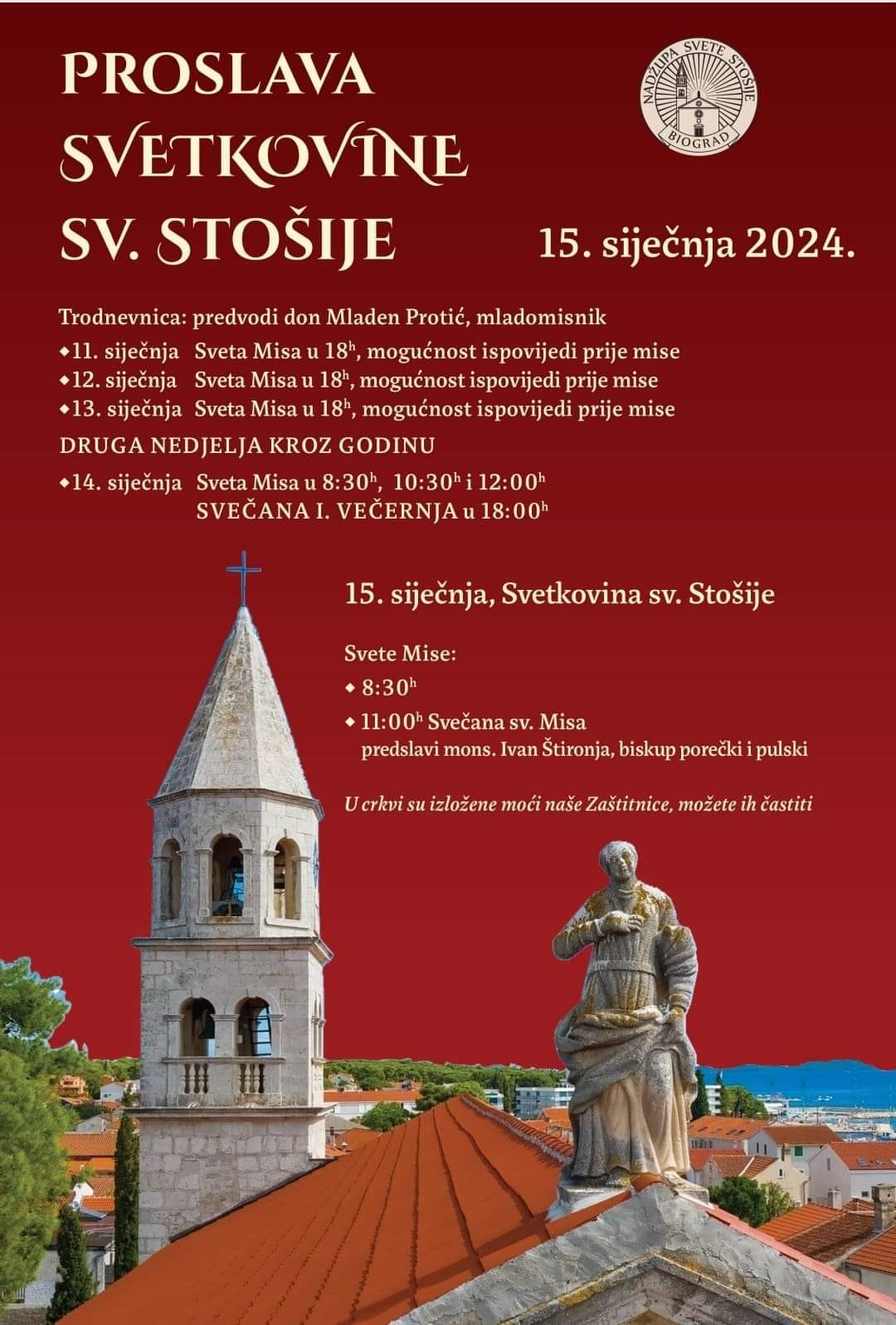 Na uočnicu sv. Stošije, u nedjelju, 14. siječnja, mise su u 8.30, 10.30 i u 12 sati. Svečanu Večernju u crkvi sv. Stošije u 18 sati predvodi biogradski župnik don Dario Tičić.