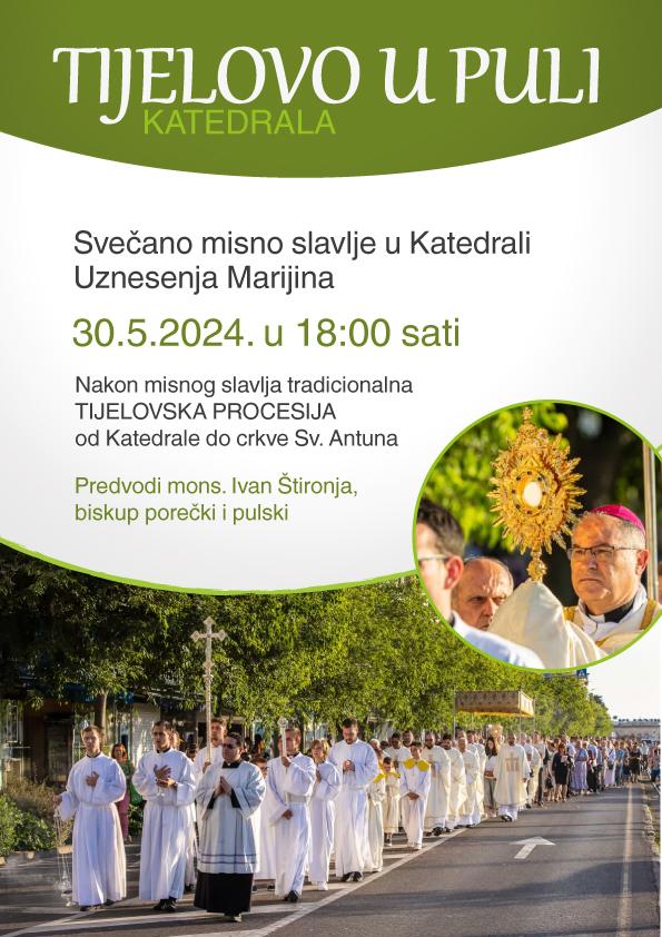 Na svetkovinu Presvetog Tijela i Krvi Kristove u četvrtak 30. svibnja, porečki i pulski biskup mons. Ivan Štironja predvodit će svečano misno slavlje i tijelovsku procesiju u Puli.