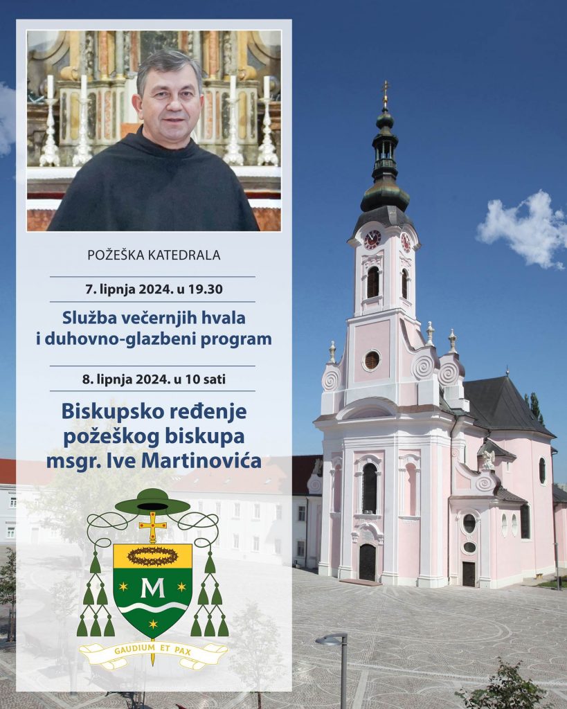 Ređenje imenovanog požeškog biskupa Ive Martinovića, TOR, bit će održano na spomendan Bezgrješnog Srca Marijina, u subotu 8. lipnja 2024., s početkom u 10 sati, u katedrali sv. Terezije Avilske u Požegi.