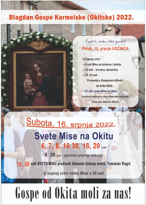 U subotu, 16. srpnja mise će na Okitu biti slavljene u 6, 7, 8, 10:30, 18 i 20 sati. U 9:30 bit će pjevana Jutarnja. Središnjim slavljem u 10:30 predsjedat će šibenski biskup Tomislav Rogić.