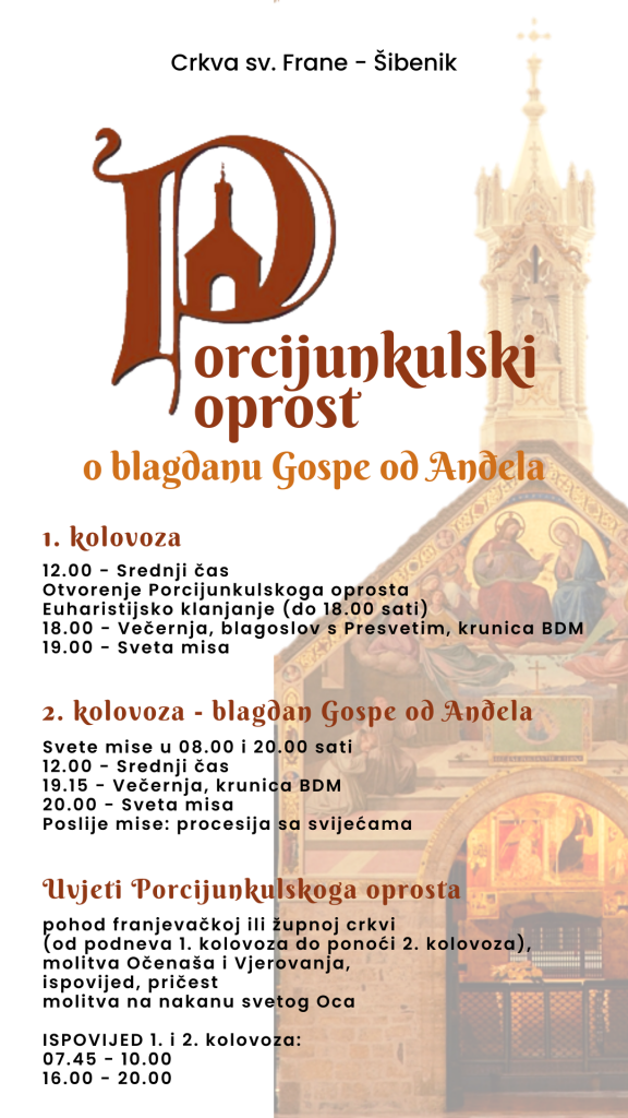 Blagdan Gospe od Anđela ili Porcijunkula svečano će biti proslavljen u crkvi sv. Frane u Šibeniku. Zbog mogućnosti dobivanja potpunog oprosta, slavlje blagdana traje dva dana.