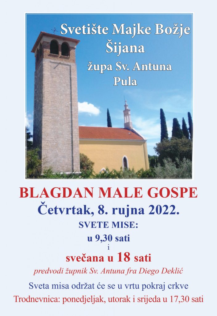 Pula, (IKA) – Blagdan Male Gospe svečano će biti proslavljen u četvrtak 8. rujna u svetištu Majke Božje od Milosti u Šijani u Župi sv. Antuna Padovanskoga u Puli.
