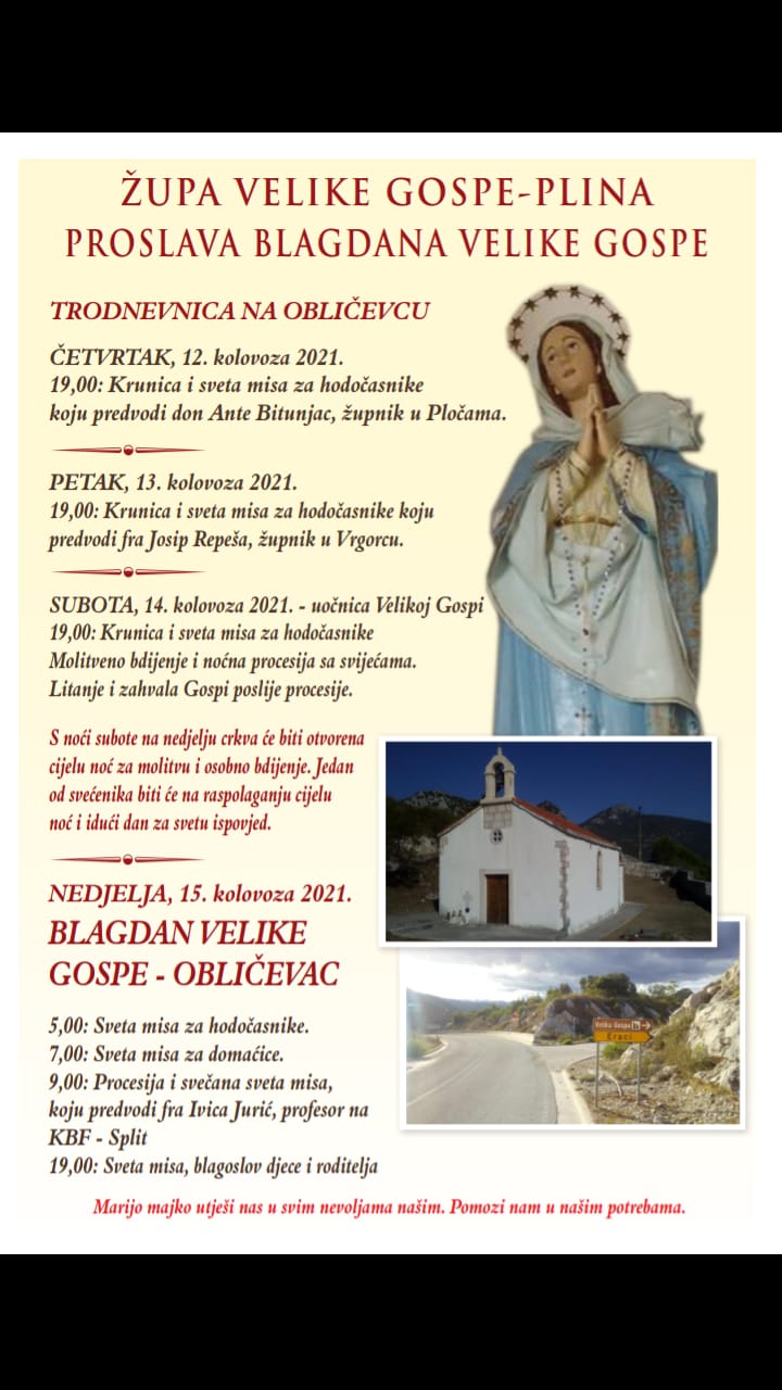 U nedjelju 15. kolovoza, na blagdan Velike Gospe u crkvi Uznesenja BDM na Obličevcu mise su u 5, 7, 9 i 19 sati. Središnjoj misi u 9 sati prethodi procesija a predvodi je fra Ivica Jurić, prof. na KBF-u u Splitu.