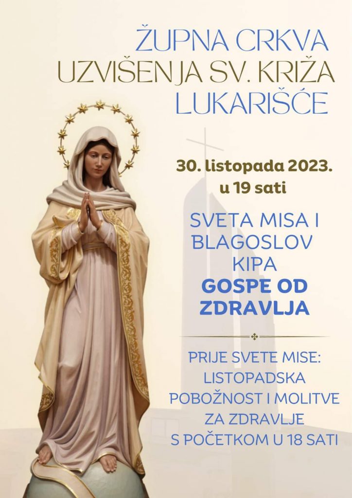 Na kraju marijanskog mjeseca, u ponedjeljak 30. listopada 2023. u župnoj crkvi Uzvišenja Svetoga Križa u Lukarišću bit će blagoslovljen kip Gospe od Zdravlja. Misa će početi u 19 sati.