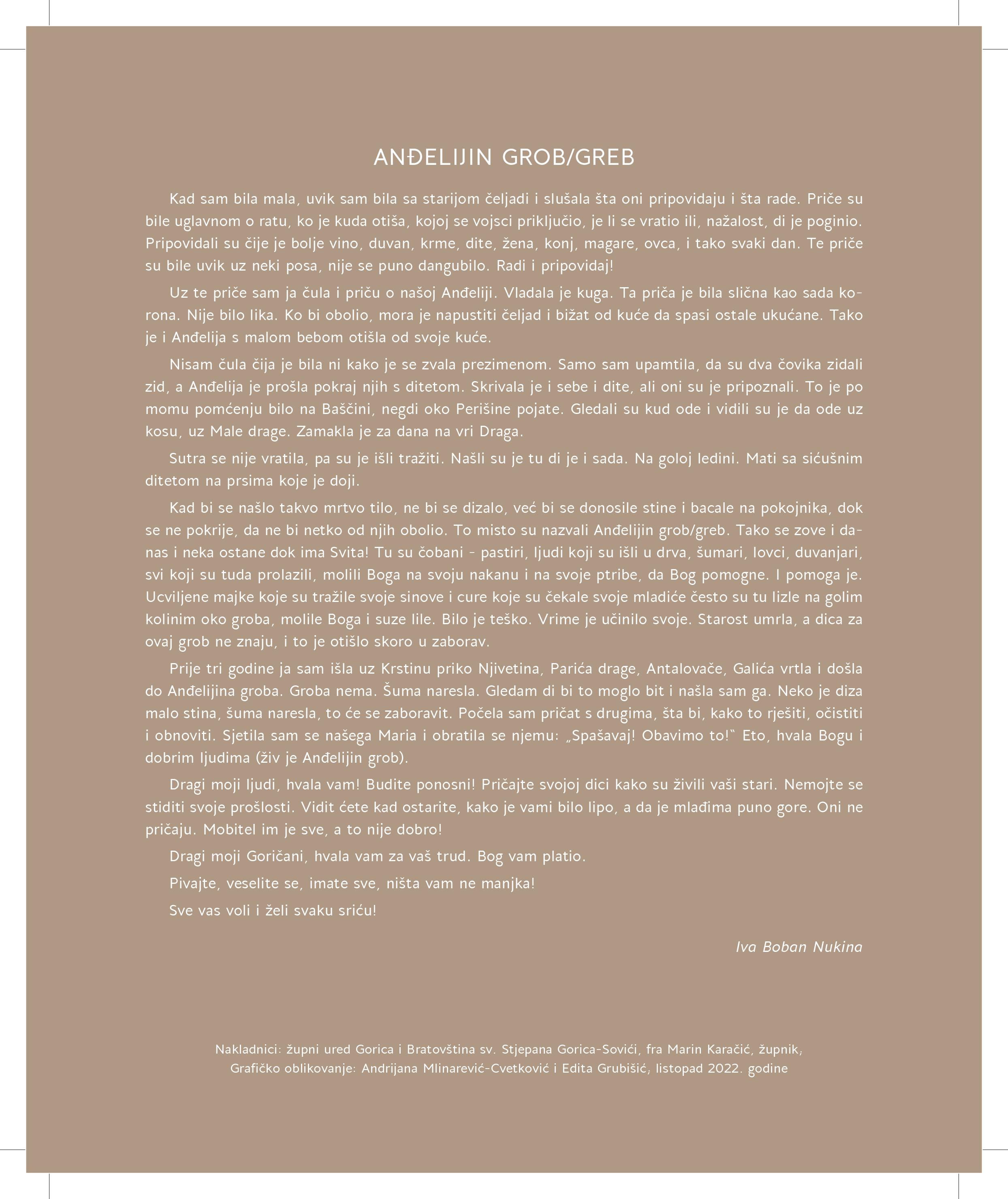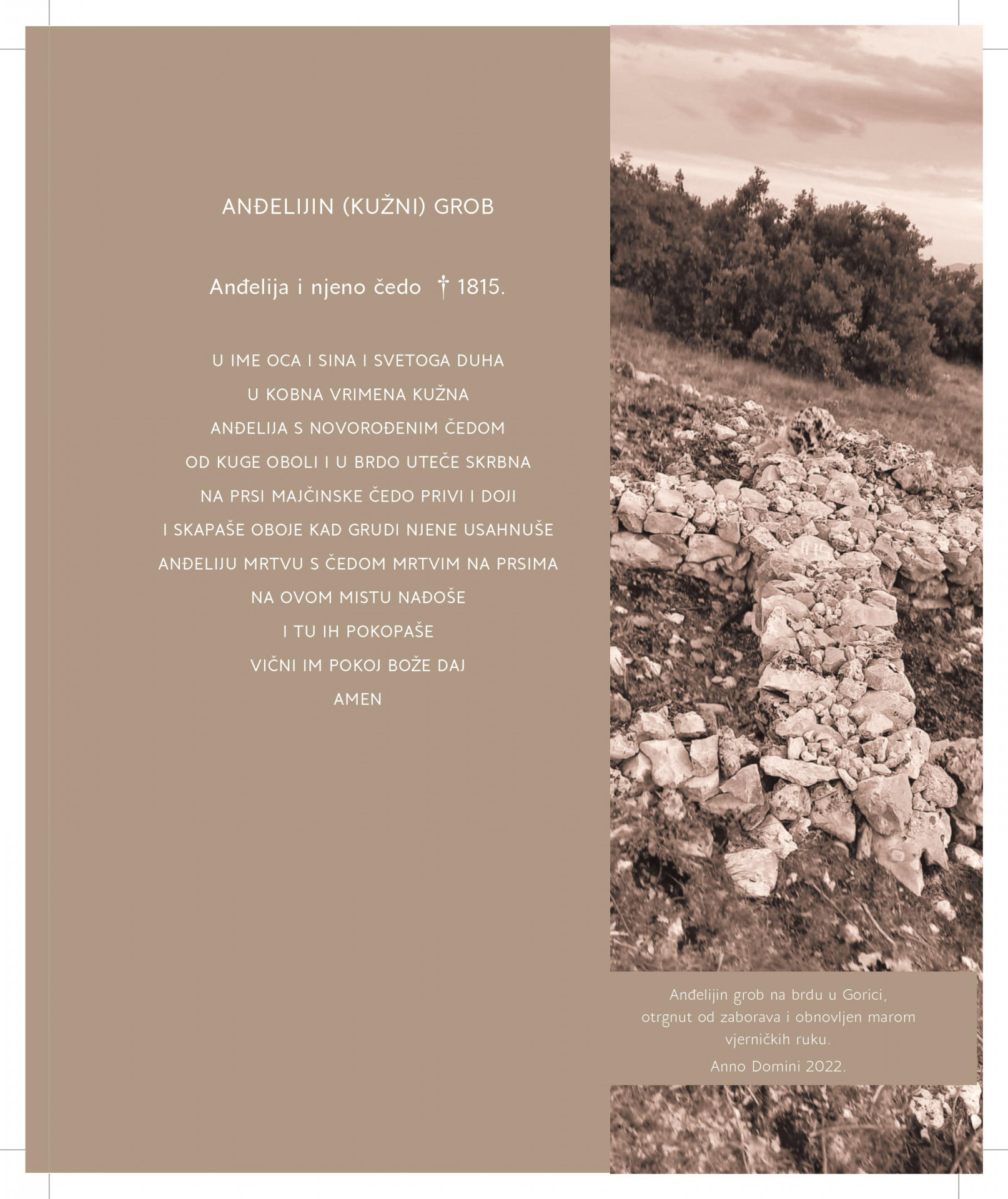Bratovština sv. Stjepana Prvomučenika Gorica-Sovići i i župni ured Gorica-Sovići organiziraju blagoslov kužnog Anđelijina groba u povodu svetkovine Svih svetih i spomena vjernih mrtvih u nedjelju 23. listopada u 14 sati na brdu iznad Gorice (pod Galića bristom, na putu od Njiverica prema Nečajnu).