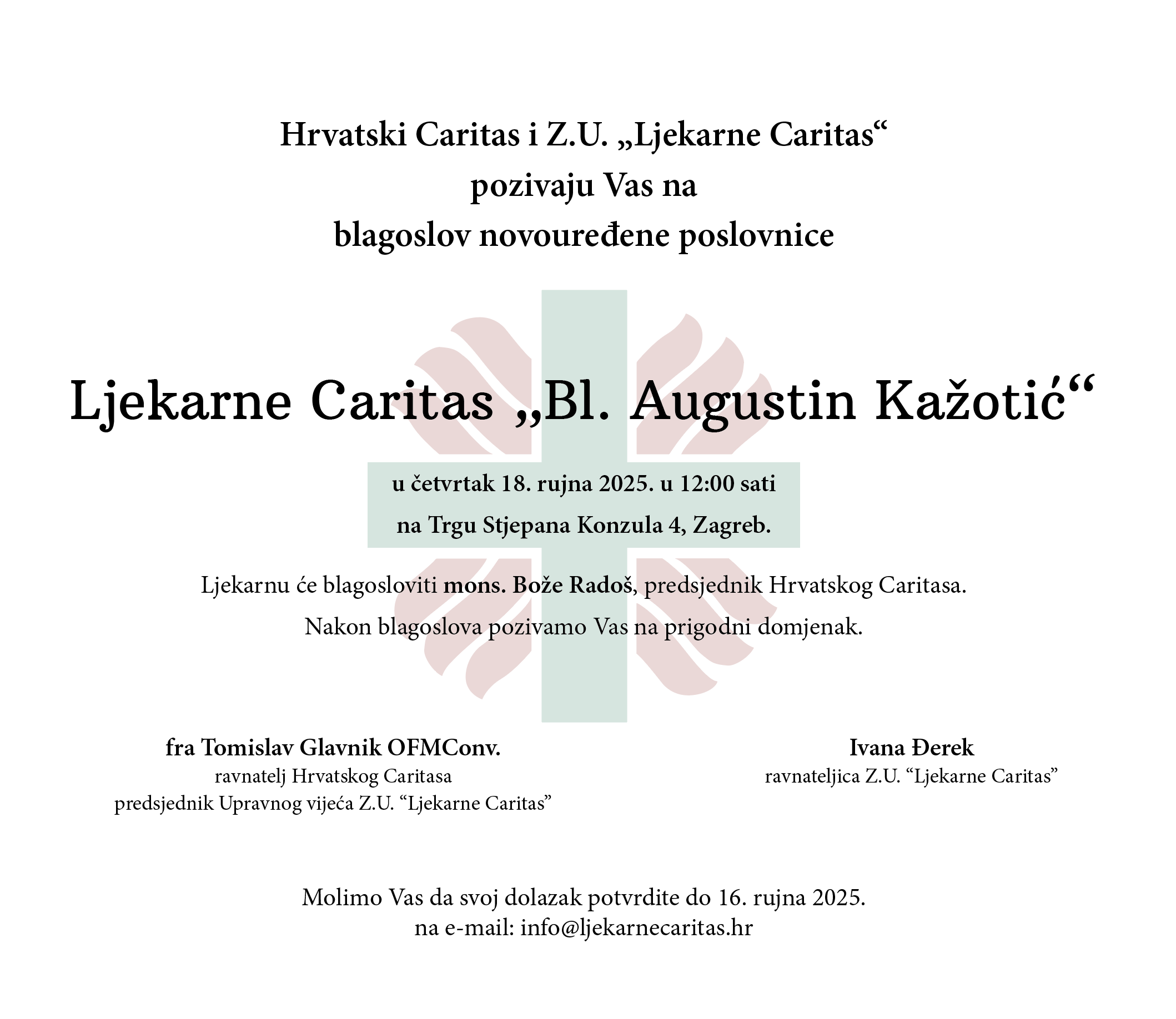Hrvatski Caritas i Zdravstvena ustanova Ljekarne Caritas upriličit će blagoslov novouređene poslovnice Ljekarne Caritas „Bl. Augustin Kažotić“ u četvrtak 18. rujna u 12 sati u Zagrebu, na adresi Trg Stjepana Konzula 4.