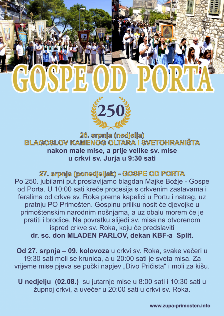 Jubilarni, 250. put u ponedjeljak 27. srpnja bit će proslavljena Gospa od Porta. U 10 sati kreće procesija od crkve Sv. Roka prema kapelici u Portu i natrag. Slijedi misa ispred crkve Sv. Roka, na otvorenom, koju će predvoditi dekan splitskog Katoličkoga bogoslovnog fakulteta prof. dr. don Mladen Parlov.
