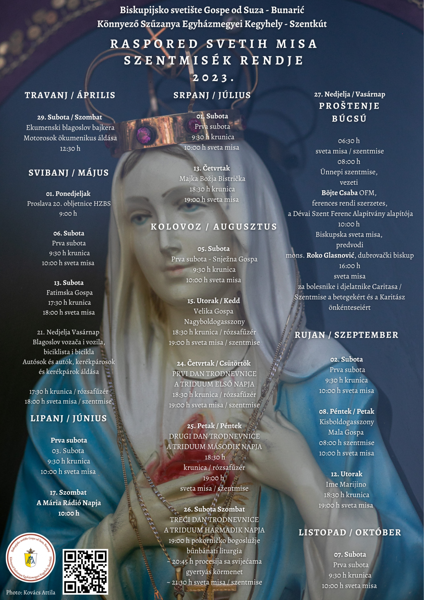 U okviru godišnjih liturgijskih i ostalih programa i dešavanja, na Biskupijskom svetištu Gospe od Suza – Bunarić, kraj Subotice, u nedjelju, 21. svibnja održat će se misa i blagoslov vozača, vozila, bicikla i biciklista. Misa je u 18 sati a prije mise će se moliti krunica.