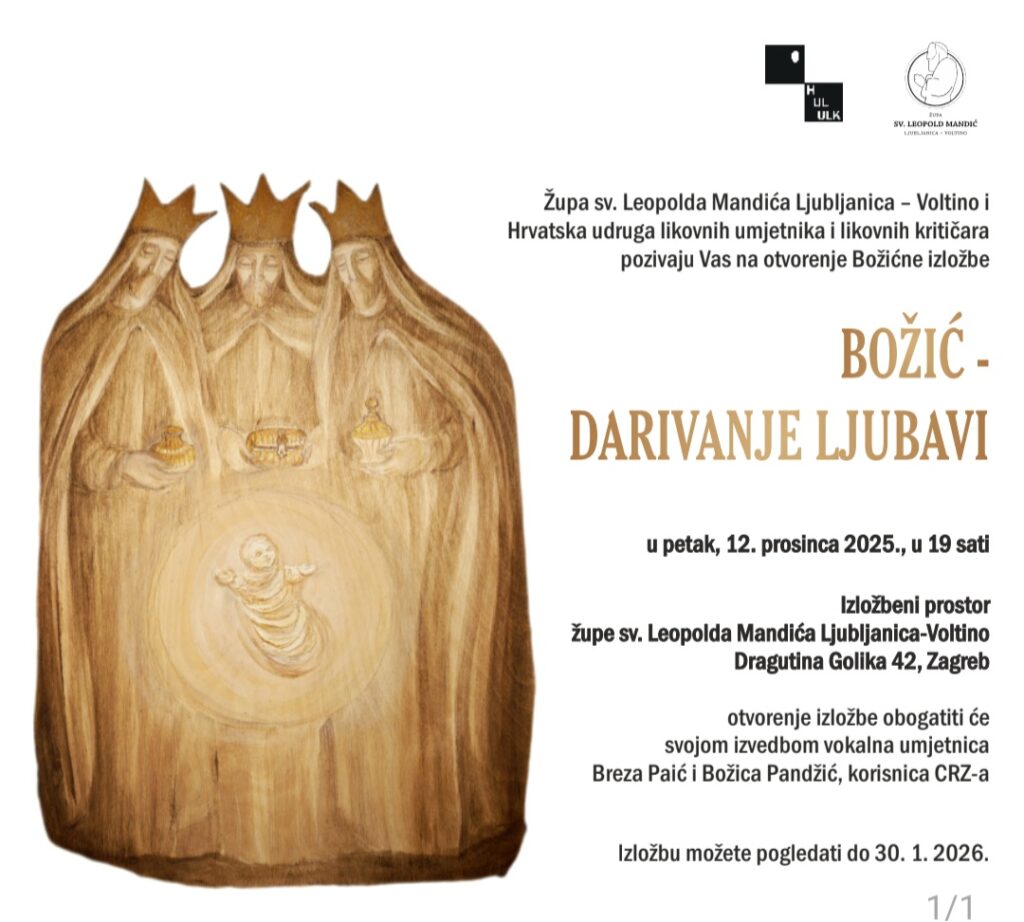 Božićna izložba članova Hrvatske udruge likovnih umjetnika i likovnih kritičara (HULULK) i njihovih prijatelja koja je već postala tradicijom, ove godine organizira se u župi sv. Leopolda Mandića Ljubljanica-Voltino u petak 12. prosinca s početkom u 19 sati, u izložbenom prostoru Pastoralnog centra, koje je od ove godine i središte djelovanja i izložbenog predstavljanja HULULK-a.