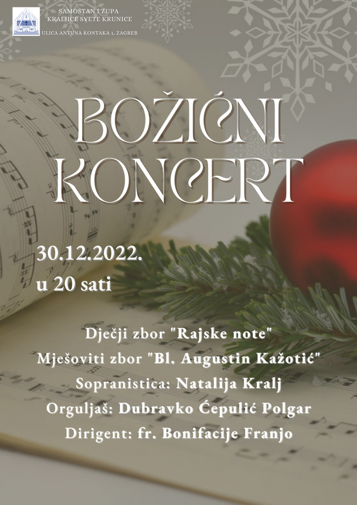 Zagreb, (IKA) – Božićni koncert bit će održan u petak 30. prosinca u 20 sati u crkvi Kraljice sv. Krunice.