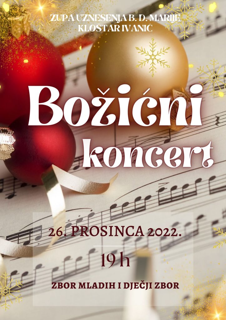 Božićni koncert Zbora mladih i Dječjeg zbora župe Kloštar-Ivanić održat će se u ponedjeljak 26. prosinca u 19 sati u župnoj crkvi Uznesenja Blažene Djevice Marije.