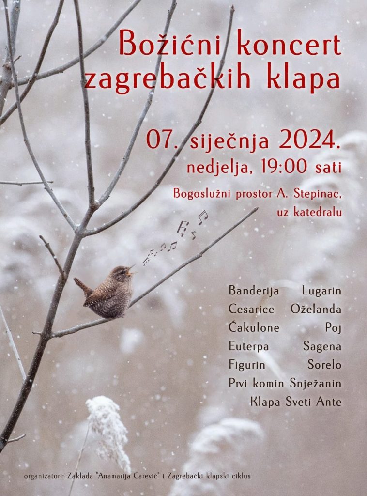Božićni koncert zagrebačkih klapa bit će održan u nedjelju 7. siječnja 2024. u 19 sati u bogoslužnom prostoru bl. Alojzija Stepinca na zagrebačkom Kaptolu.