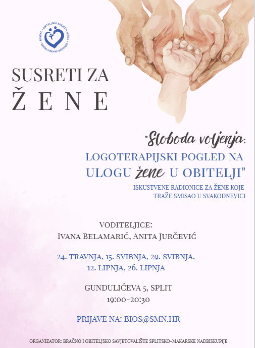 Bračno i obiteljsko savjetovalište Splitsko-makarske nadbiskupije organizira ciklus iskustvenih radionica pod nazivom „Sloboda voljenja: logoterapijski pogled na ulogu žene u obitelji“, namijenjen majkama koje žele produbiti razumijevanje vlastite svakodnevice i pronaći dublji smisao u životnim okolnostima u kojima se nalaze.