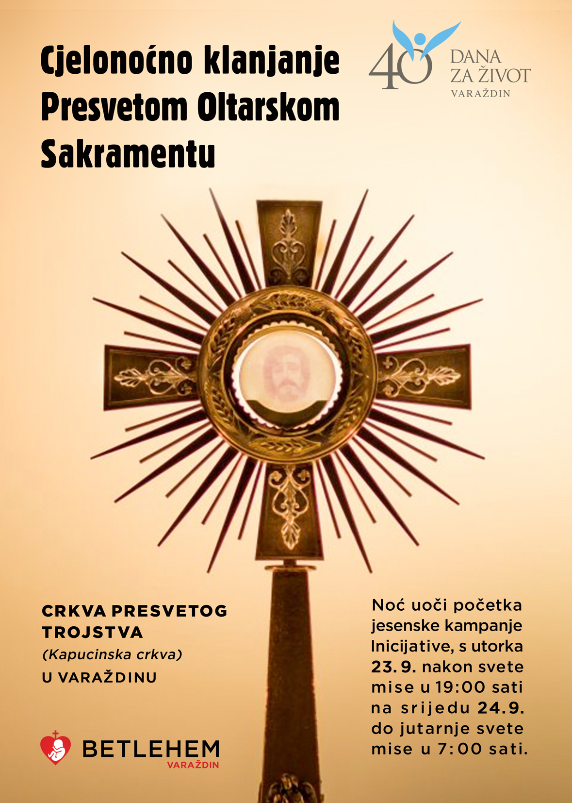 Inicijativa “40 dana za život” i Udruga Betlehem Varaždin organiziraju cjelonoćno klanjanje Presvetom Oltarskom Sakramentu u kapucinskoj crkvi Presvetog Trojstva u Varaždinu, uoči nove, jesenske kampanje Inicijative “40 dana za život” – četrdesetodnevne molitve pred bolnicama.
