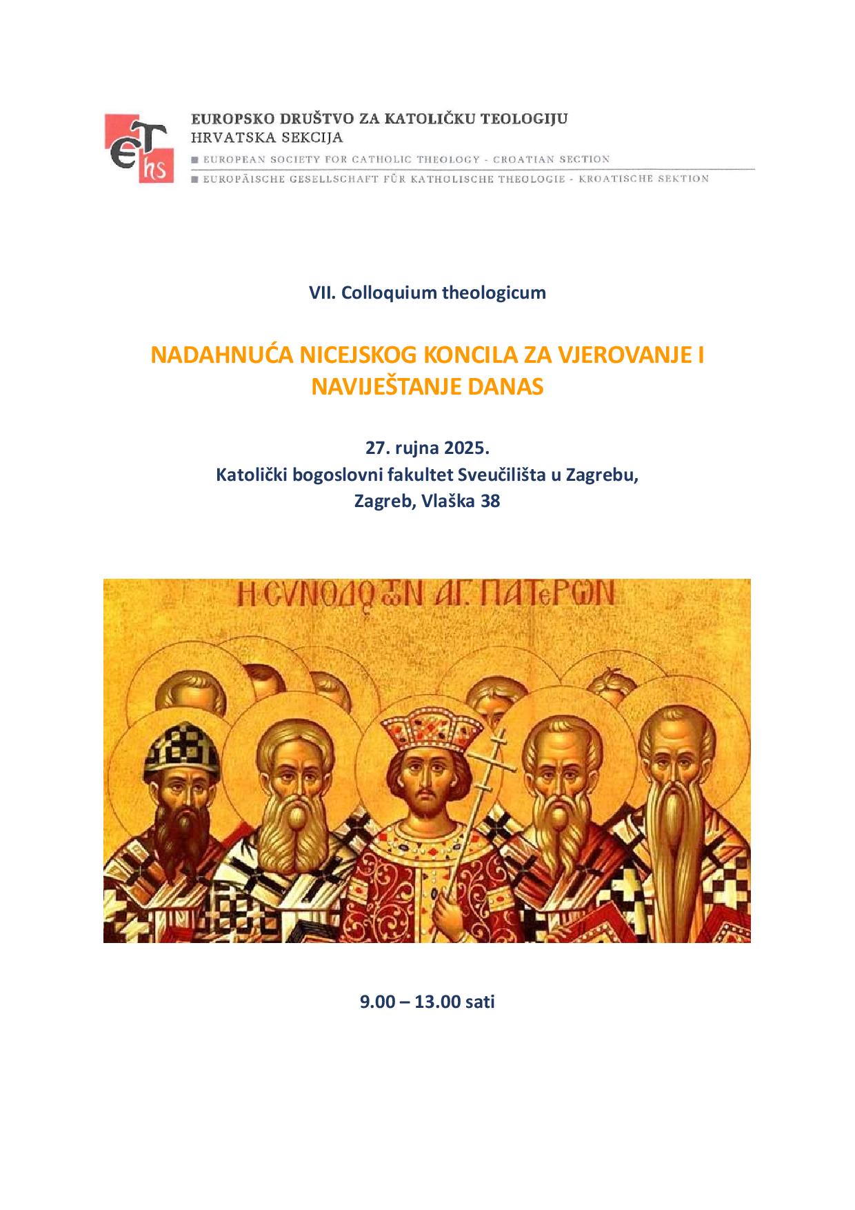 Sedmi Colloquium theologicum o temi „Nadahnuća Nicejskog koncila za Vjerovanje i naviještanje danas“ održat će se u subotu 27. rujna na Katoličkome bogoslovnom fakultetu Sveučilišta u Zagrebu.