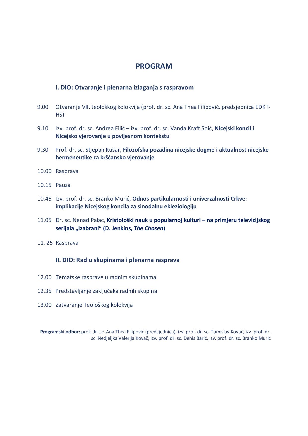 Nakon stanke slijedi izlaganje izv. prof. dr. sc. Branka Murića „Odnos partikularnosti i univerzalnosti Crkve: implikacije Nicejskog koncila za sinodalnu ekleziologiju“ nakon čega će dr. sc. Nenad Palac održati izlaganje o temi „Kristološki nauk u popularnoj kulturi – na primjeru televizijskog serijala ‘Izabrani’ (D. Jenkins, The Chosen)“.